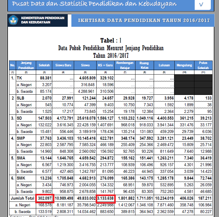 Ikhtisar Data Pendidikan tahun 2016-2017, Data dari Kemendikbud