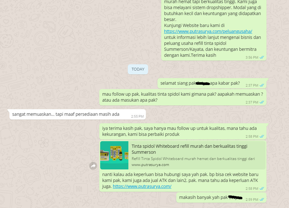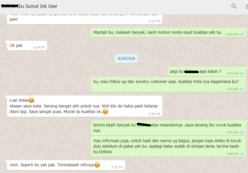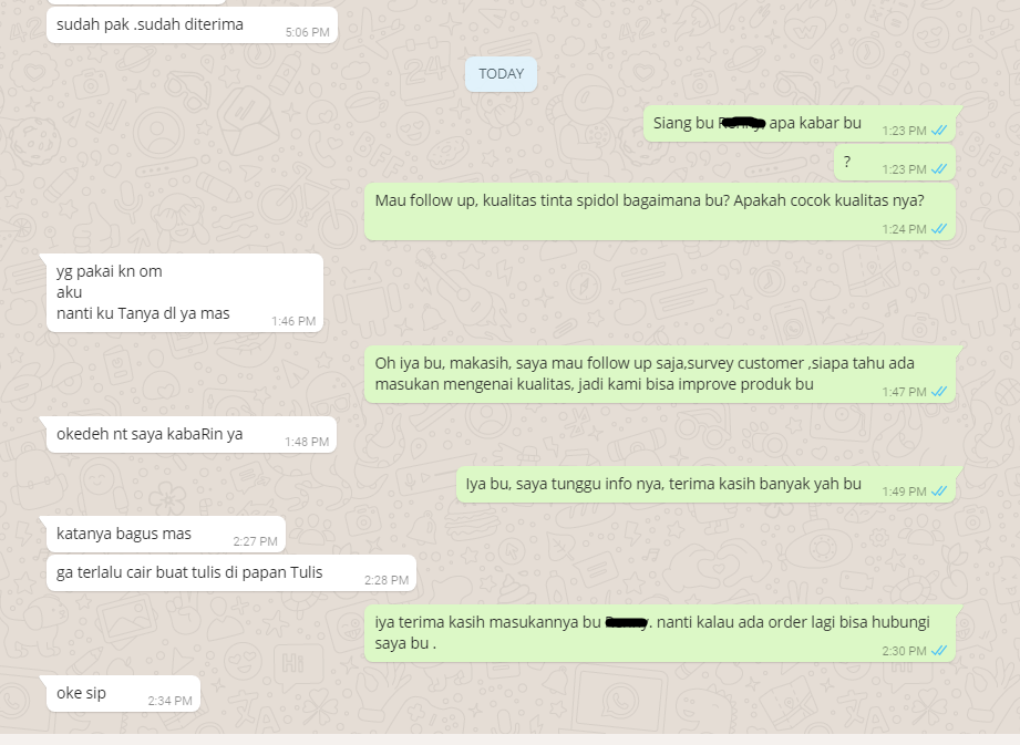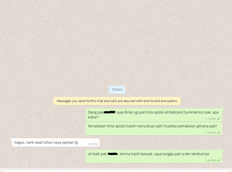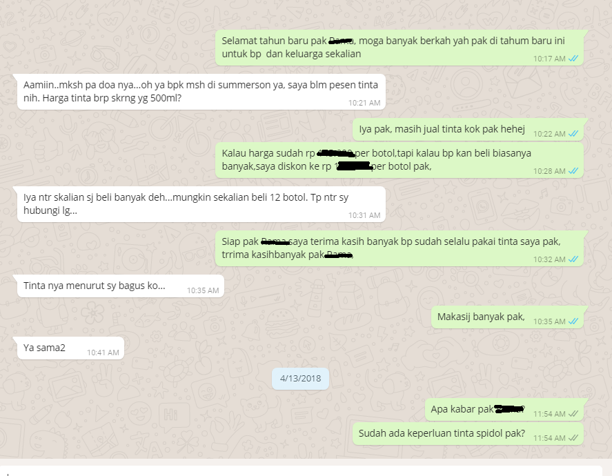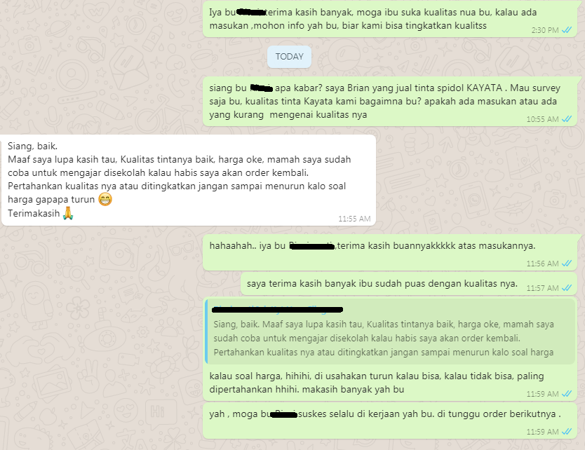 Berikut kami tampilkan cuplikan pembicaraan via Whatsapp chat (WA ) antara sales kami dengan customer baru mau pun langganan setia kami yang sudah memakai tinta kami lebih dari 4 tahun. Berikut hanya sebagian kecil testimoni customer yang sudah merasakan manfaat dari tinta spidol murah berkualitas kami baik yang merk Summerson ataupun Kayata.