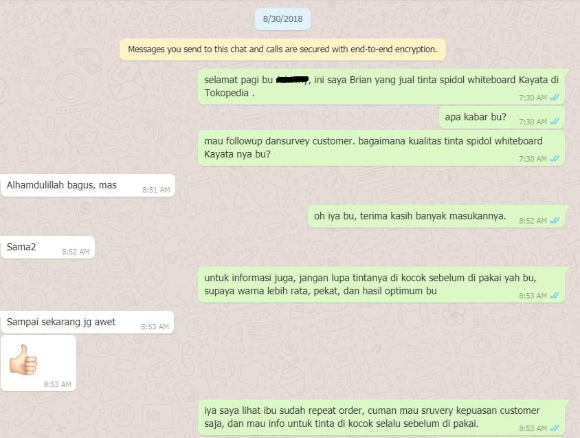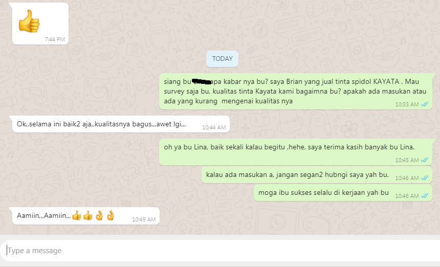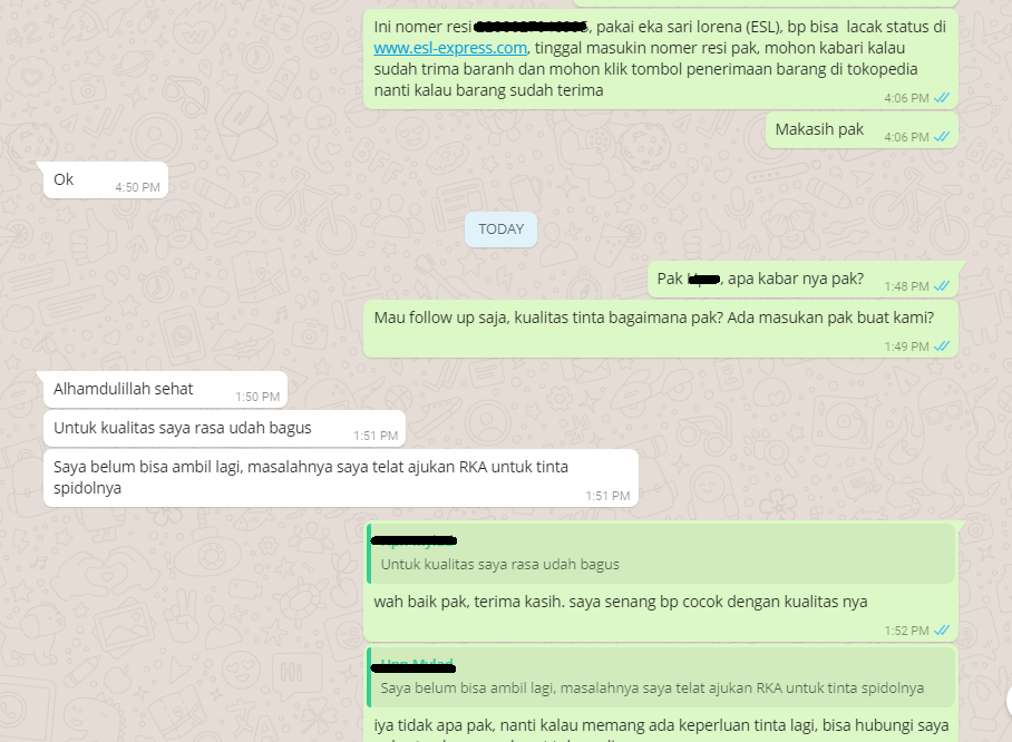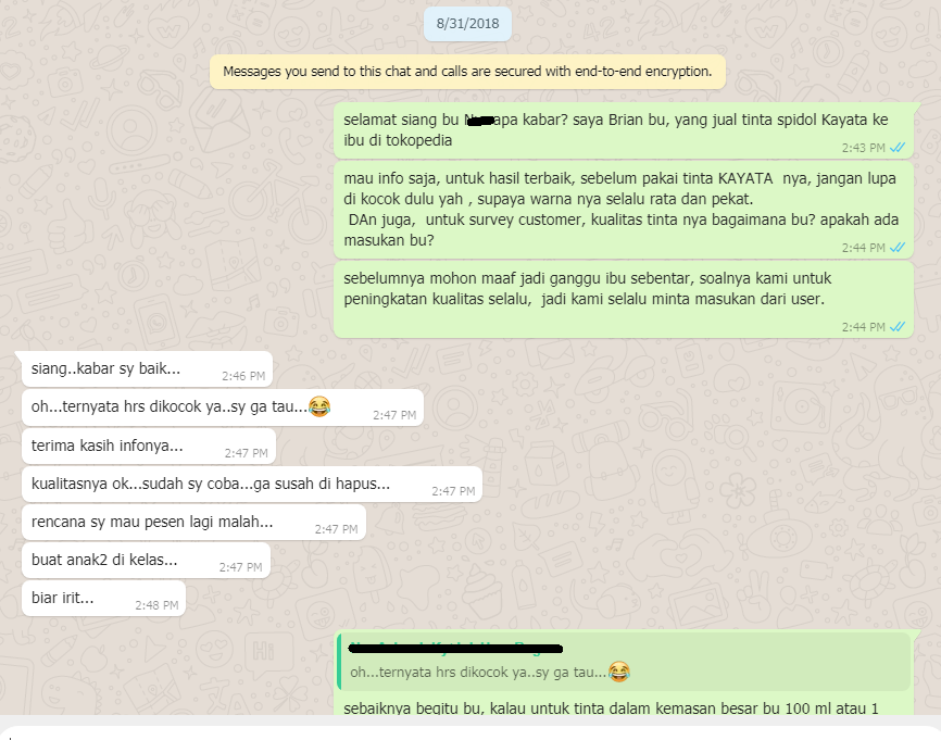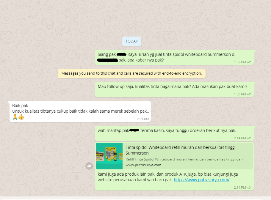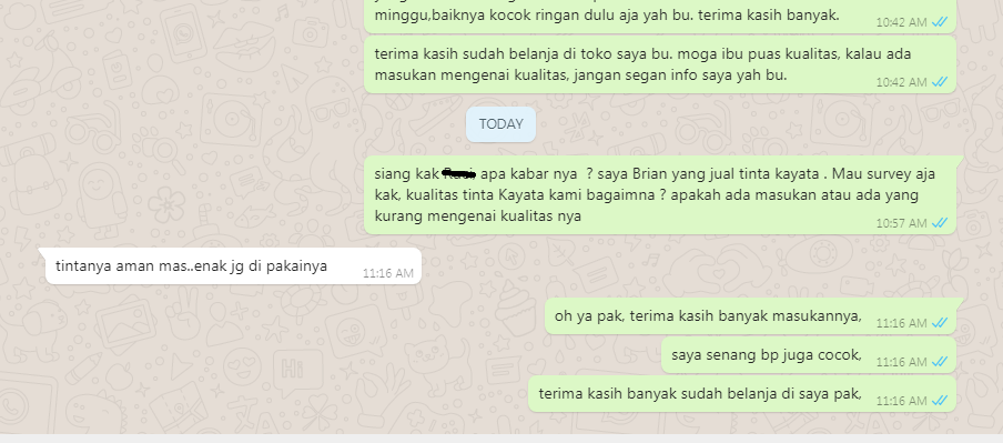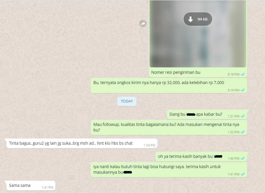 Berikut kami tampilkan cuplikan pembicaraan via Whatsapp chat (WA ) antara sales kami dengan customer baru mau pun langganan setia kami yang sudah memakai tinta kami lebih dari 4 tahun. Berikut hanya sebagian kecil testimoni customer yang sudah merasakan manfaat dari tinta spidol murah berkualitas kami baik yang merk Summerson ataupun Kayata.